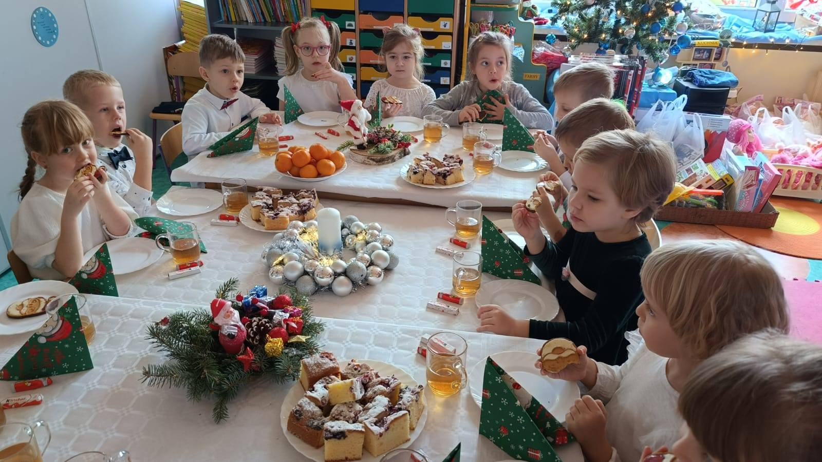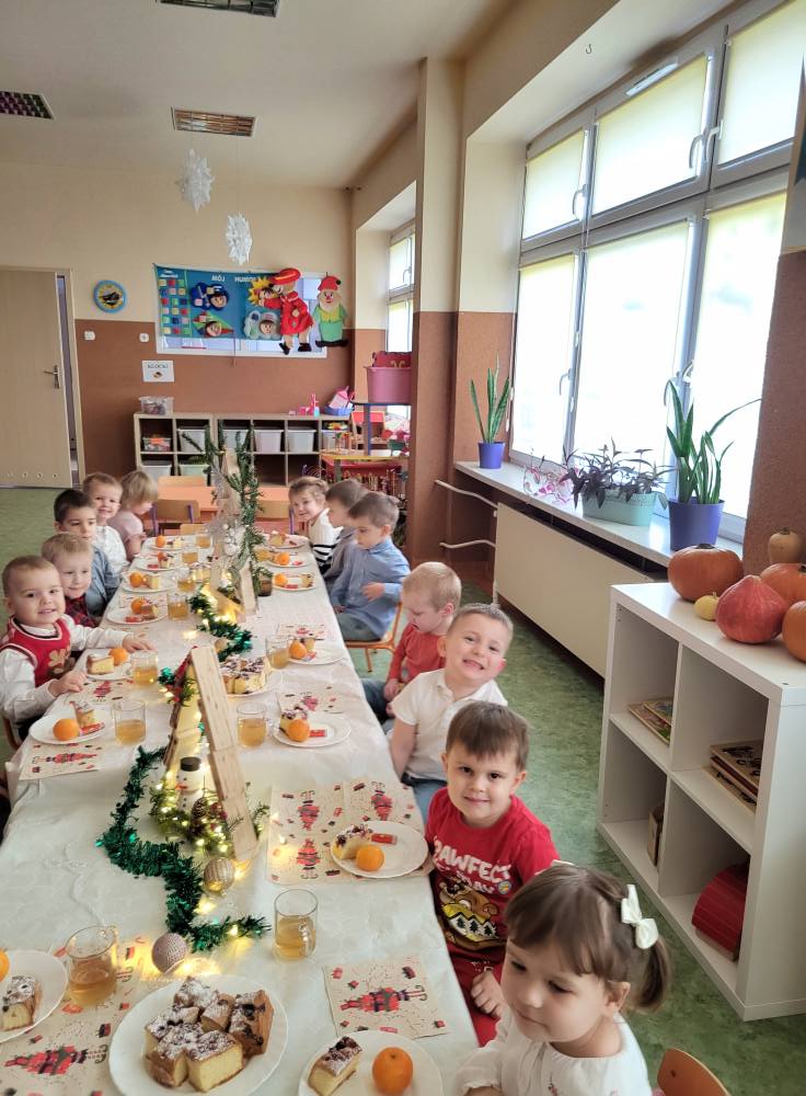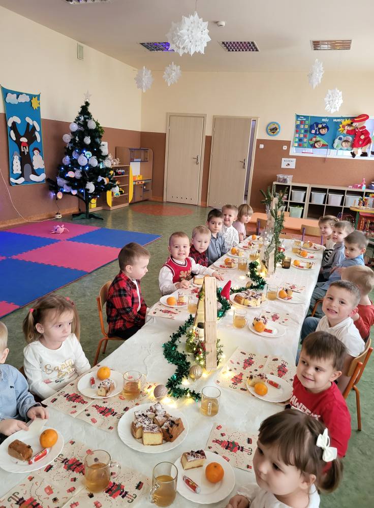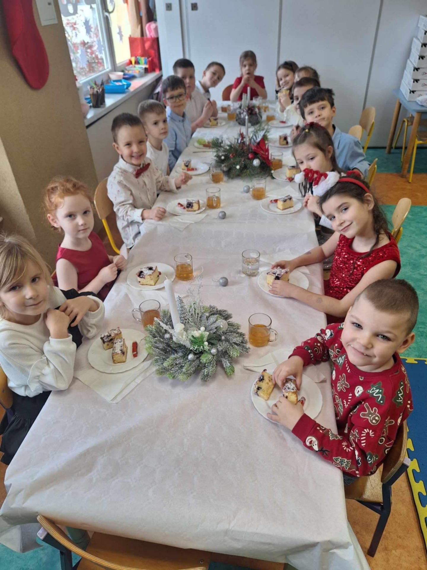 20 grudnia odbyła się przedszkolna wigilia. Tego dnia panowała radosna, ożywiona atmosfera. Świąteczne dekoracje oraz dzieci w galowych strojach wprowadzały nastrój oczekiwania na wyjątkowe, niecodzienne wydarzenie. Uroczystość rozpoczęły jasełka, następnie były wspólne życzenia i kolędowanie. Na stole pojawiła się tradycyjna ryba, a także inne świąteczne przysmaki. Nie zabrakło również prezentów, które dzieciom wręczył Mikołaj.