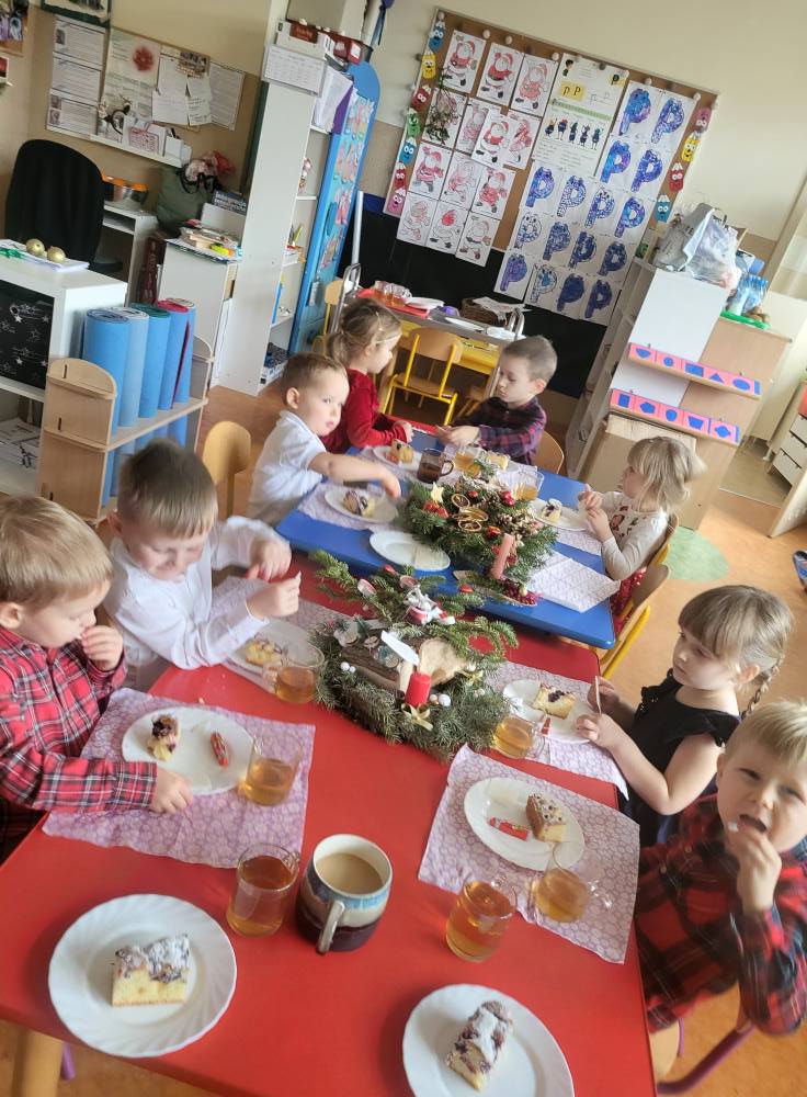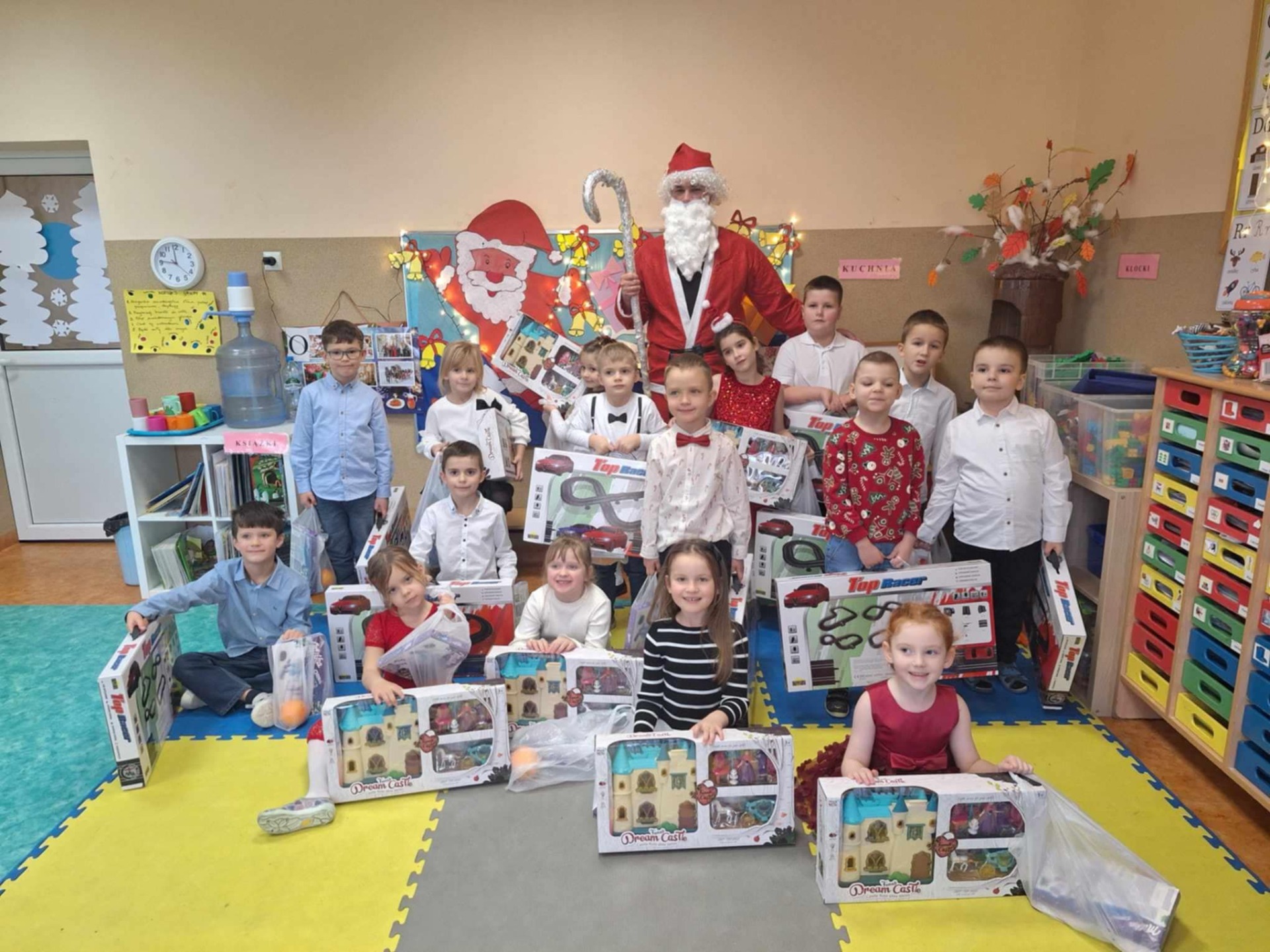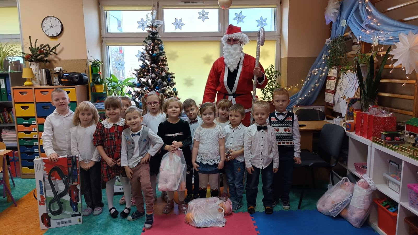 20 grudnia odbyła się przedszkolna wigilia. Tego dnia panowała radosna, ożywiona atmosfera. Świąteczne dekoracje oraz dzieci w galowych strojach wprowadzały nastrój oczekiwania na wyjątkowe, niecodzienne wydarzenie. Uroczystość rozpoczęły jasełka, następnie były wspólne życzenia i kolędowanie. Na stole pojawiła się tradycyjna ryba, a także inne świąteczne przysmaki. Nie zabrakło również prezentów, które dzieciom wręczył Mikołaj.