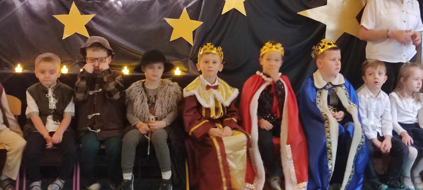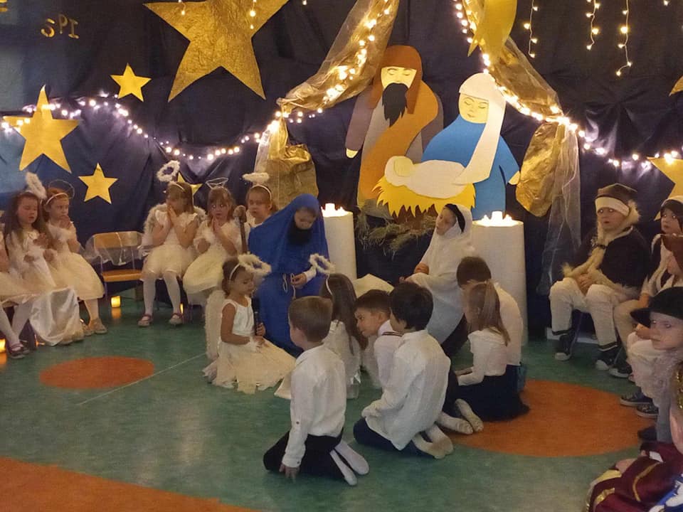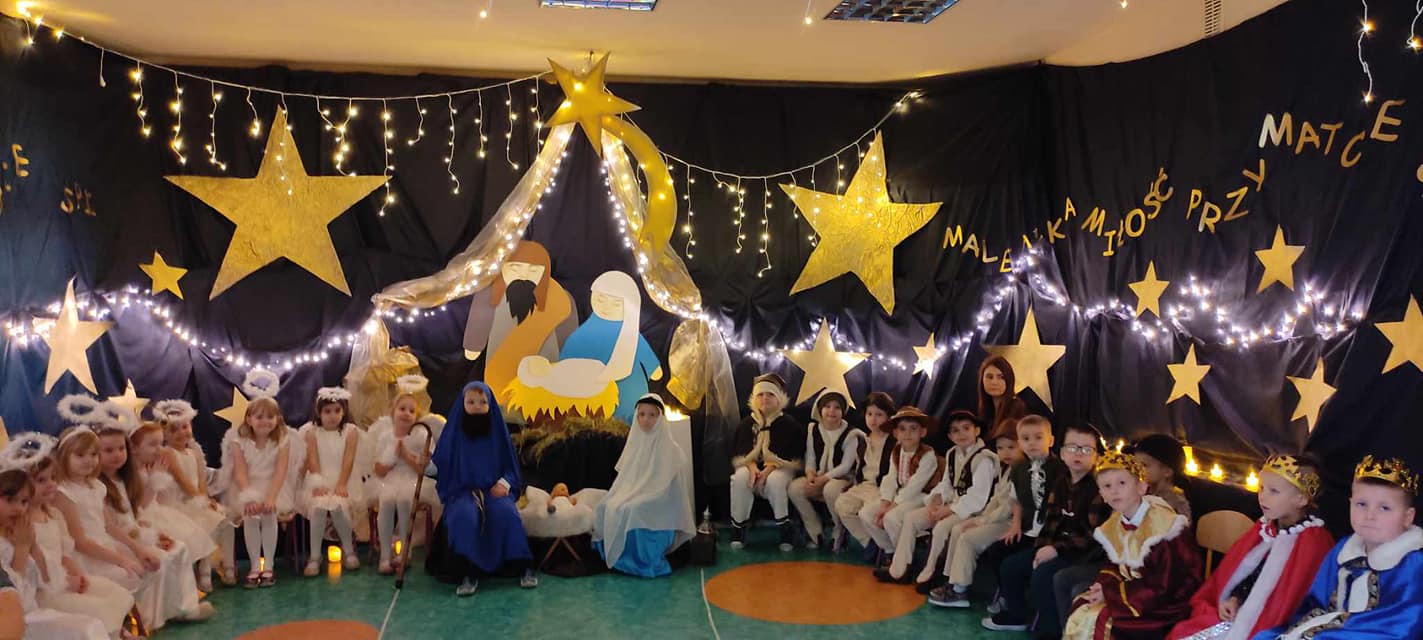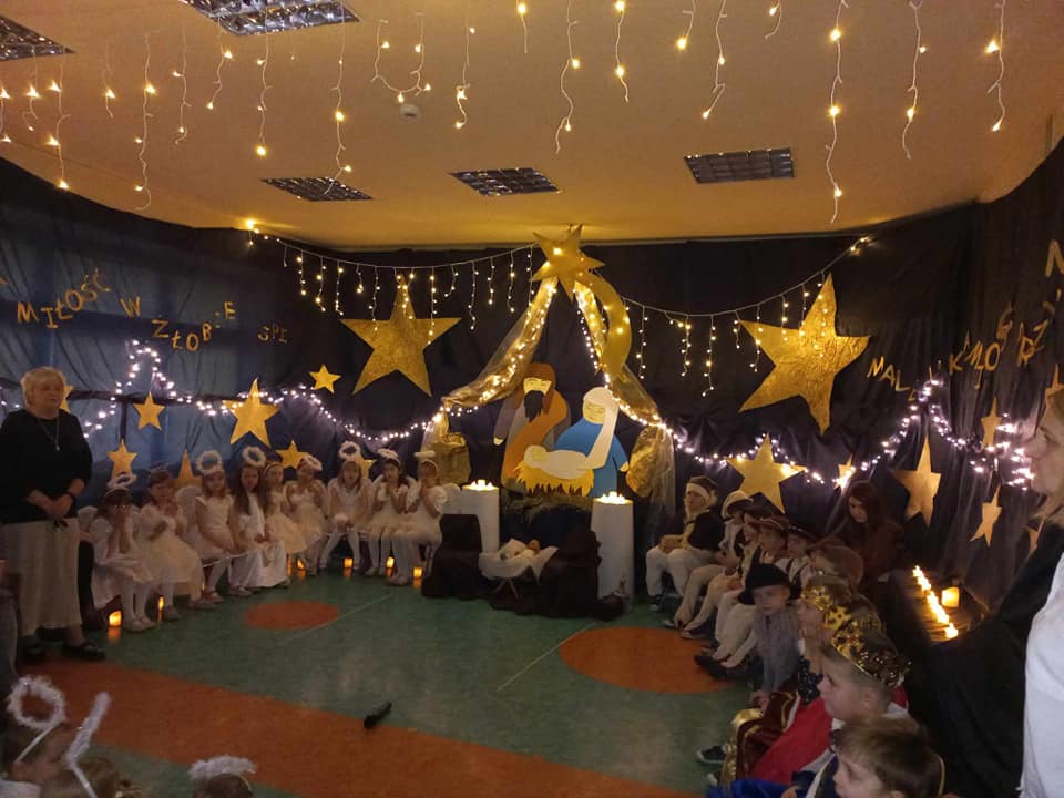 Dzisiaj dzieci z grupy IX i V zaprosiły całą społeczność przedszkolną na Jasełka.Przedstawienie było wyjątkowe. Przedszkolaki w pięknych strojach przedstawiły historię narodzin Dzieciątka Jezus. Z dużym przejęciem i zaangażowaniem interpretowały w sposób aktorski swoje role. Scena wypełniona była aniołkami, które śpiewały i recytowały przygotowane wierszyki.dary. Szczególne brawa należą się malutkim aniołkom z grupy II, którzy pokonali treme i przepięknie zaśpiewali ze starszymi kolegami. Do szopki przybyli pastuszkowie, trzej królowie oraz dzieci, które przyniosły Dzieciątku.Nie zabrakło również pięknych polskich kolęd, pastorałek oraz tańca. Wspaniała scenografia i muzyka nadała temu niecodziennemu spotkaniu uroczysty i nastrojowy klimat.