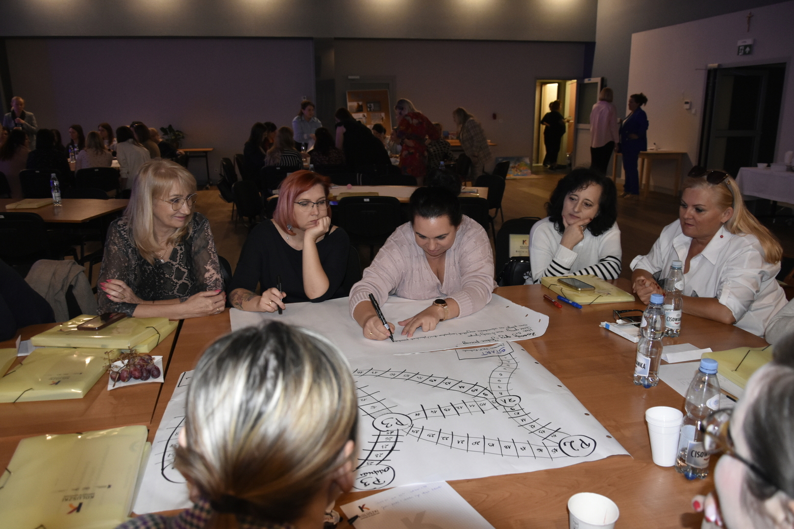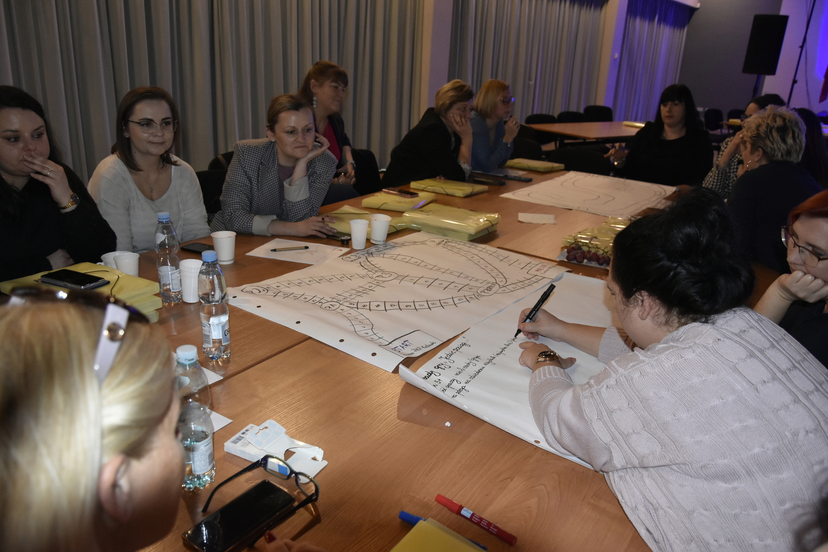 Przedstawione zagadnienia stanowiły wstęp do zorganizowanych w dalszej części warsztatów, podczas których zainicjowane zostały działania mające na celu utworzenie sieci współpracy placówek wychowania przedszkolnego,w ten sposób, aby przykładem dobrych praktyk realizowanych w ŁCDNiKP, nauczycielki spotykały się w celu wymiany doświadczeń, wyzwalania wzajemnych inspiracji, a w efekcie końcowym, aby wspólnie stworzyć projekt edukacyjny dla dzieci, związany z Gminą Koluszki. Podczas gdy nauczycielki tworzyły pierwsze gry, goście honorowi zajęli się kreowaniem bohatera, który będzie towarzyszył dzieciom podczas proponowanych zadań. I tak oto powstała koncepcja postaci o imieniu Koluszek. Padła też propozycja, aby Koluszek stał się postacią płci żeńskiej. Nic nie stoi na przeszkodzie, aby dzieciom towarzyszyła para bohaterów: Koluszek i Koluszka. Warto nadmienić, że projekt edukacyjny o tematyce lokalnej idealnie wpisuje się w bieżące wydarzenia. W tym roku obchodzić będziemy 75 – lecie nadania praw miejskich Koluszkom. Wydarzenie spotkało się z pozytywnym odbiorem, o czym świadczy utworzony już harmonogram kolejnych spotkań kadry pedagogicznej z poszczególnych przedszkoli.