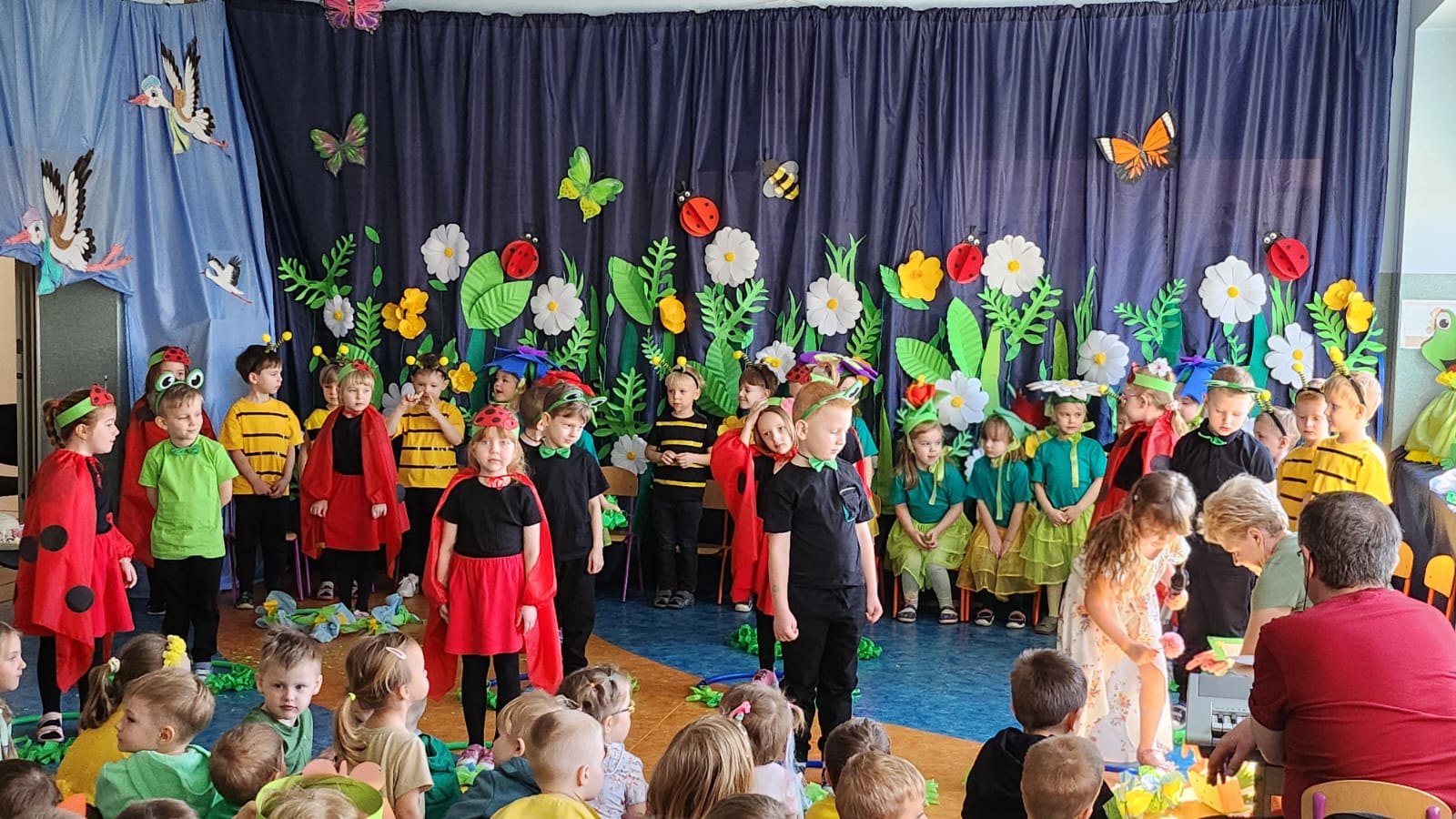 Tego dnia cała sala zamieniła się w prawdziwy, wiosenny ogród pełen kwiatów, ptaków i owadów.Dzieci ubrane w wiosenne barwy, śpiewem i tańcem przywołały ciepłe, słoneczne dni!